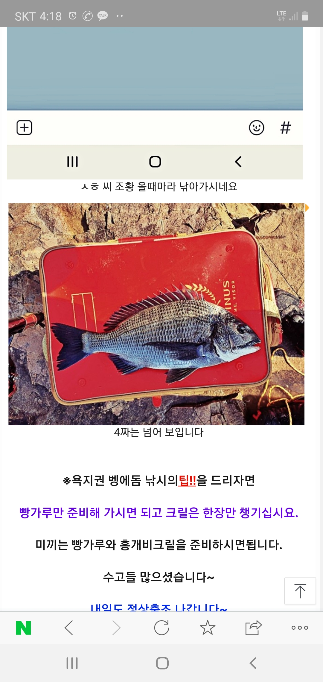 첫감시 대구호야 일반 0 1718 0 2019.11.06 18:29 ① 출 조 일 : 토요일 ② 출 조 지 : 통영 ③ 출조 인원 : 1 ④ 물 때 : 13 ⑤ 바다 상황 : ⑥ 조황 요약 : 첫감시네요 0 글쓴이 0 0 Lv.1 대전성호 일반회원 55 (0.5%) 네 +1 11.06 두번째감시 (등업용) 11.06 첫감시