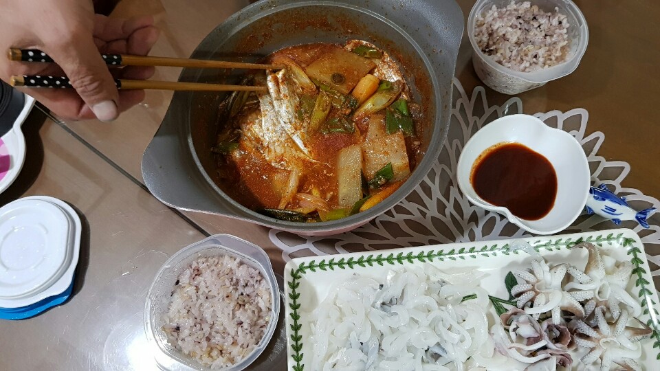 집에와서 오늘은 벵에돔껍질숙회 대신 갑오징어 회랑 오늘 잡은 갈치 찌게로 와이프랑 맛있게 먹었습니다.