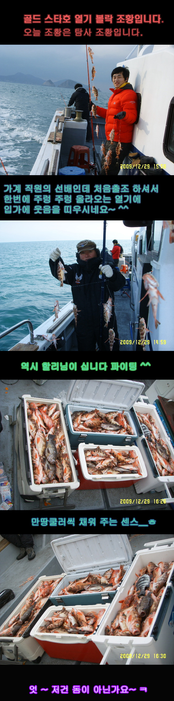 심해 갈치 쿨러만땅 후 왕열기 왕볼락도 쿨러만땅__ㅎ 여수골드피싱출조점 여수 0 1034 0 2009.12.29 22:06 [골드스타호] 여수 골드 피싱 갈치 낚시 출조점!!! 홈페이지 바로 가기 클릭 ◈ 출 조 일 : 2009년 12월 28일(월요일) ~ 12월29일(화요일 )◈ 출 조 지 : 백도 거문도 근해◈ 출조인원 : 골드피싱호-탐사인원 ◈ 물 때 : 4물~5물(여수기준)◈ 바다상황 : 좋음▣ 조황내용 ▣: 안녕하세요 골드피싱 선단입니다. 저희 골드피싱호가 12월25일 심해 갈치를 2회 출조하여 쿨러만땅 조황을 올린 후 오늘은 2호 골드스타호 1대 항해하여 고객님들을 모시고 출조하기전에 임직원끼리 열기,볼락을 위해 설치한 좌표 및 포인트 확인차 탐사 출조하였습니다.백도 먼바다 거문도 대삼부도 일원을 수십곳을 샅샅이 점검해본결과 곳곳에따라 차이는 있었지만 왕볼락 왕열기가 주렁주렁 달려서 꽃을 피웠습니다.왕열기 왕볼락으로 5000쿨러~8000쿨러 만땅 채워왔습니다.1호 골드피싱호는 심해 대 갈치를 2010년 5월 30일까지~2호 골드스타호는 왕열기 왕볼락을 2010년 5월30일까지 퍼담으러 출조합니다.초보조사님들도 망설이지 마시고 연락주십시오고객님들의 보다 더 나은 조황과 편의를 위해 더욱더 노력하겟습니다.앞으로 더욱좋은 서비스와 조황으로 보답하겟습니다.저희 골드피싱 출조점을 이용해주셔서 다시한번 감사드립니다.문의전화☏ 010-2519-0346 , 061-685-0346 매일 출조합니다 연락 주세요~ 최 신 형 갈 치 낚 시 전 용 선 2 대 보유!!!출발일시 : 매일 오후2(기상 이변이 없는한 매일출조)출발장소 : 여수시 소호동 소호출장소앞(출조점 바로앞)물 : 전동릴,낚시대(장비없으신분은 유상대여 가능함)주소검색 : 여수시 소호동 1216번지 또는 소호출장소★☆★예약 현황★☆★ 사전 예약 합니다~ 미리예약해주세요 더많은 자료는 홈페이지로~~^^ 0 글쓴이 0 0 Lv.1 여수골드피싱출조점 점주선장 1,442 (14.4%) 안녕하세요 여수골드피싱입니다. 12.30 2010년에도 대박터지세요~ 12.29 심해 갈치 쿨러만땅 후 왕열기 왕볼락도 쿨러만땅__ㅎ 12.25 심해 대갈치 조황입니다. 12.24 130M권 심해 갈치 조황입니다. 12.14 이것이야말로 초대박입니다.