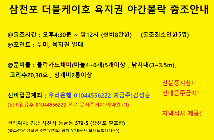 @@출조시간은 금일 오후5시30 ~ 새벽1시 선비는1인8만 (최소출조인원5명) 현재7명 자리여유있습니다