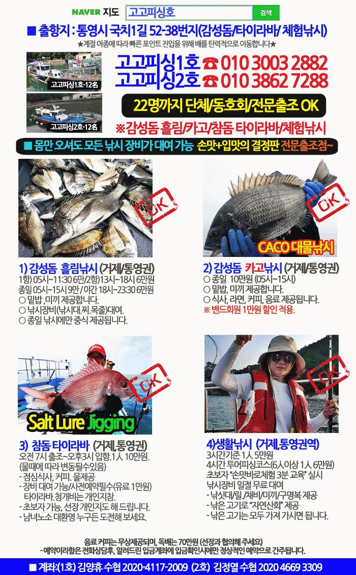 12인승 넓은 낚싯배에서 즐기는 감성돔낚시, 전문가와 손맛을 볼 수 있는 체험낚시도 함께 운영되며, 고고피싱호에는 감성돔 낚시장비, 릴, 구명복 등을 대여 해 드리고 있습니다.제대로 낚시를 할 수 있는 출조 전문선을 이용해 주시길 바랍니다