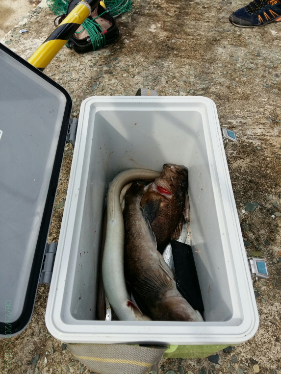 새벽에는 갈치가 한창이고요, 손맛좀 보신 손님 쿨러에는 장어, 이시가리, 우럭, 갈치 등등
