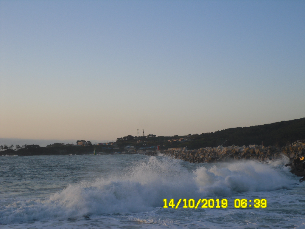 바다는 파도가 거칠고 물색이 흐리며 서풍이 약하게 부는 맑고 쌀쌀한 아침입니다.