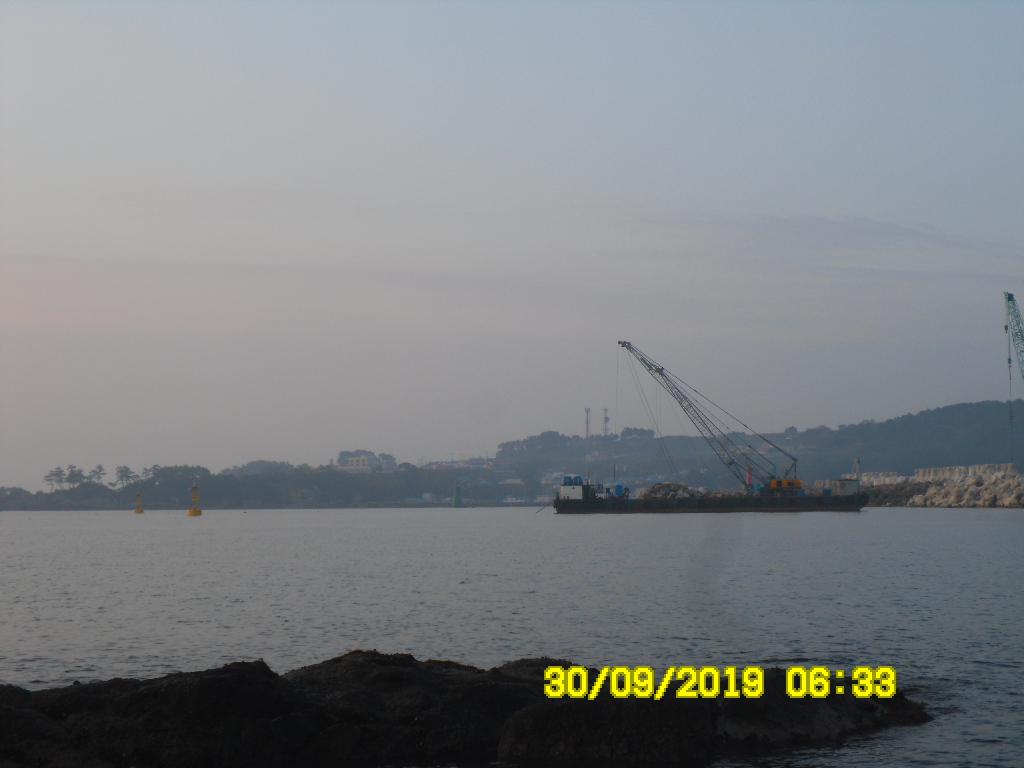 바다는 잔잔하고 물색이 맑으며 바람이 거의 없는 맑은 아침입니다.
