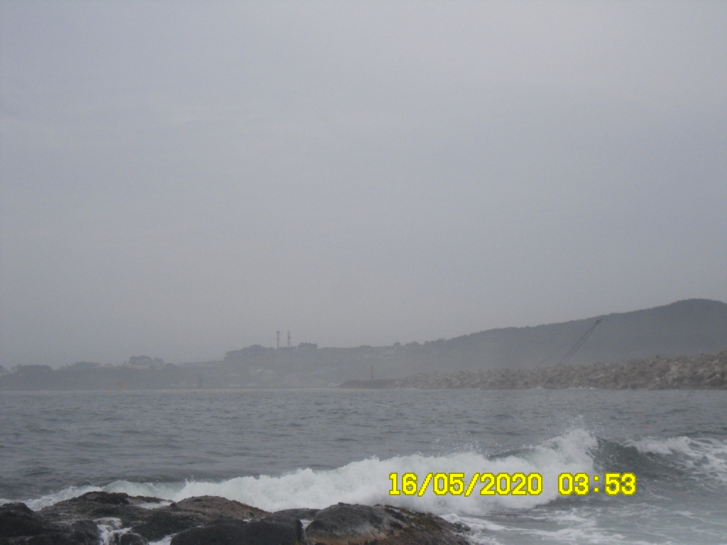 바다는 약한 파도가 있고 물색은 보통이며 바람이 거의 없는 안개낀 아침입니다.