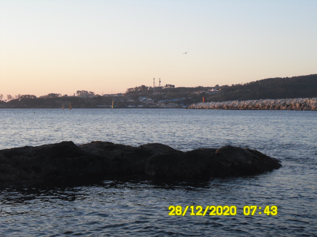 바다는 잔잔하고 물색이 맑으며 서풍이 약하게 부는 맑은 아침입니다.