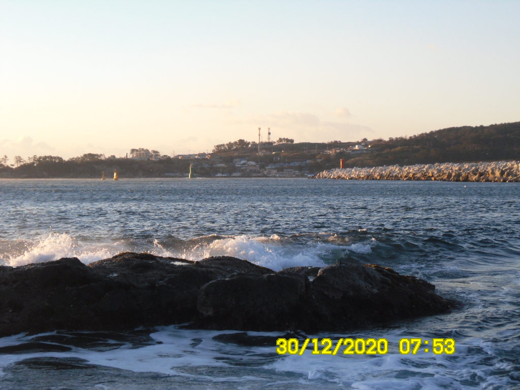 바다는 약한 너울이 있고 물색이 맑으며 서풍이 강하게 부는 맑은 아침입니다.