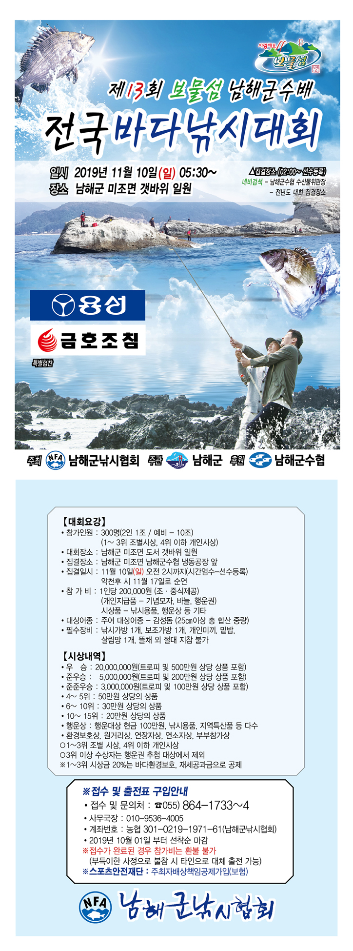 뽈라구2님!! 지적해 주신데 대해 더욱 신경을 써서 대회를 진행하겠습니다. 남해군 미조면 일대에서 300명을 모집해 150군데의 포인트를 만들기 위해 저희 협회와 미조낚시자율공동체가 최대한 좋은 자리를 만들어 최고의 낚시터를 참가선수님들께 앉혀드리고자 심혈을 기울이고 있습니다. 저희 협회와 미조낚시자율공동체도 더욱 좋은 포인트를 발굴해 전국 최고대회의 위상을 높이는데 최선의 노력을 다할 것을 약속드리겠습니다. 감사합니다.