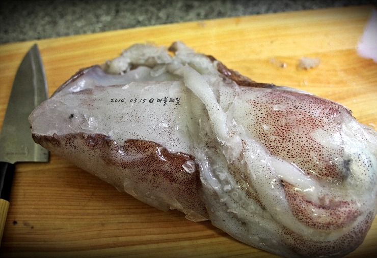 다음은 튀김을 만들기위해 오징어살에 튀김가루를 묻힌다!