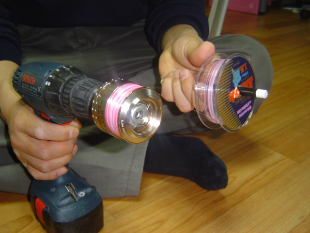 그리고 감는 방법은 그렇게 어렵지 않습니다. 스플만 축에 고정시키고 원줄케이스는 고정축(매직팬이 좋아요)과 케이스가 느슨하게 하여 드릴 회전속도에 맞쳐 돌아가게하고 손으로 적당하게 제동을 걸어 장력이 어느정도 유지되면서 감으면 됩니다.(제철소 코일감는 방법입니다.)그리고 왼손을 앞뒤로 이동하며 골고루 감길수 있도록 해주면 됩니다.