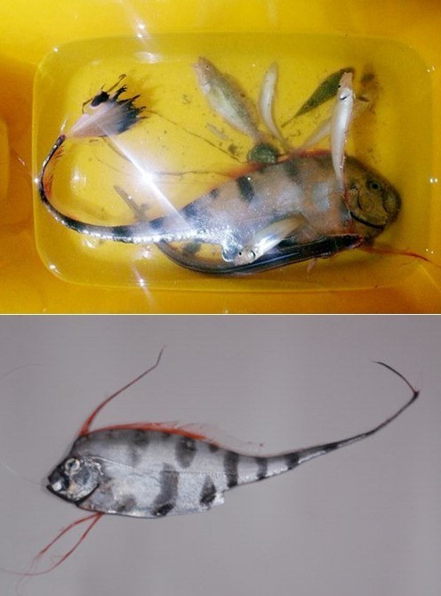 사진 속 괴물고기는 붉은 돔 모양에 곤충 더듬이 모양을 한 2개의 지느러미가 보인다. 꼬리 부분은 길고 가늘며 끝부분이 부채살 모양임을 알 수 있다.