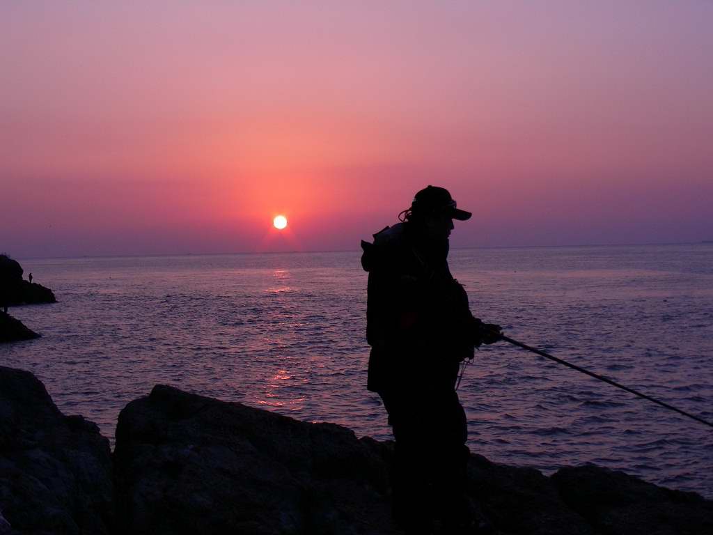 새벽에 내도에서 본 일출과 낚시인