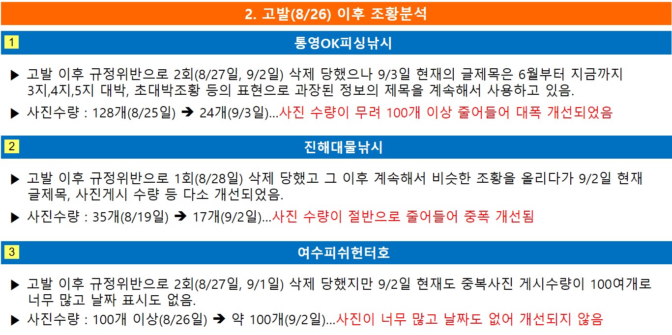 인낚 공지내용은 흩어져 공지한 내용들을 쉽게 볼 수 있도록 간략히 요약했으며, 지난 8/26일 고발한 3개 선사의 조황은 1~2회 삭제당한 후 현재는 많이 개선되었으나 여수피쉬헌터호는 사진을 100여개 여전히 중복해서 올리고 있고 심지어는 일부사진은 날짜표시 없이 게시하는 등 문제의 심각성을 인지하지 못하고 있음을 알수 있음. 이런 선사는 계속해서 제재를 가해 개선되길 기대합니다.