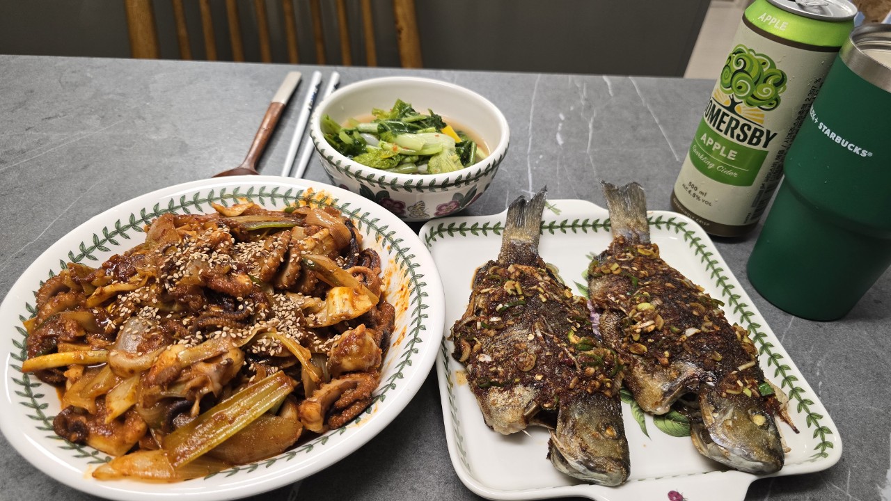 주꾸미 볶아 주면서 옆에서 오늘 잡은 벵에돔도 구워 줍니다 ^^