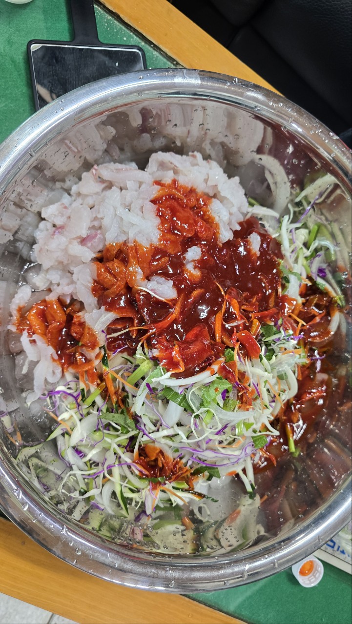 같이 간 숭 은고수 김진수 형님께서 물회 꺼리를 준비 해 오셔서 낚시점에서 먹고 가기로 합니다