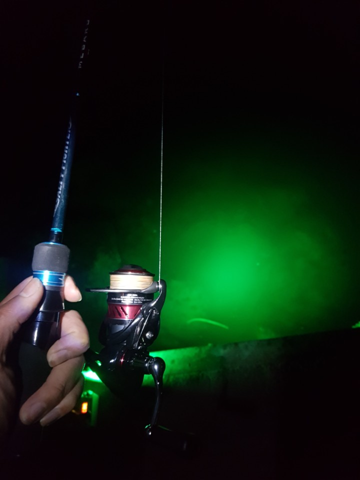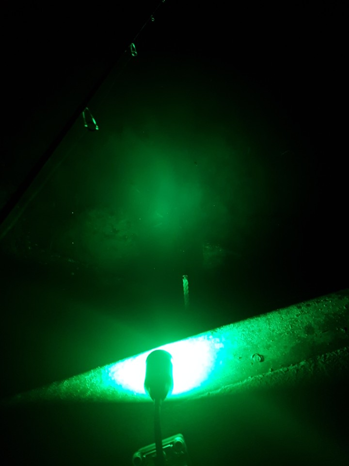 집어등에 점점 고기가 몰려들고, 15~18정도 되는 볼락이 노는데 집어등 아래에 있는