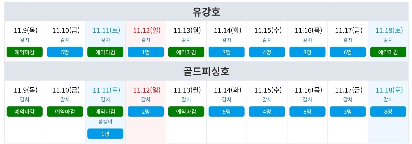 ▶ 11월 10일 (금) 기상 악화 출항 취소 ▶ 11월 11일 (토) 골드피싱호 (예약완료), 유강호 (예약완료) ▶ 11월 12일 (일) 골드피싱호 (2자리), 유강호 (1자리) ▶ 11월 13일 (월) 골드피싱호 (예약완료), 유강호 (1자리) ▶ 11월 14일 (화) 골드피싱호 (5자리), 유강호 (3자리) ▶ 11월 15일 (수) 골드피싱호 (4자리), 유강호 (4자리) ▶ 11월 16일 (목) 골드피싱호 (5자리), 유강호 (3자리) ▶ 11월 17일 (금) 골드피싱호 (3자리), 유강호 (6자리) ▶ 11월 18일 (토) 골드피싱호 (8자리), 유강호 (예약완료)