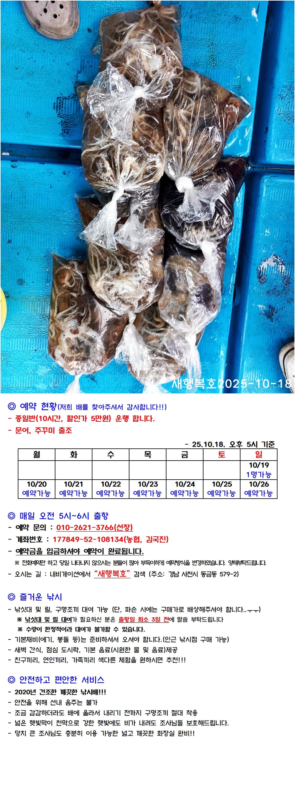 오늘 야간 호래기선상낚시 주간 감성돔낚시 예약 가능합니다. 감사합니다