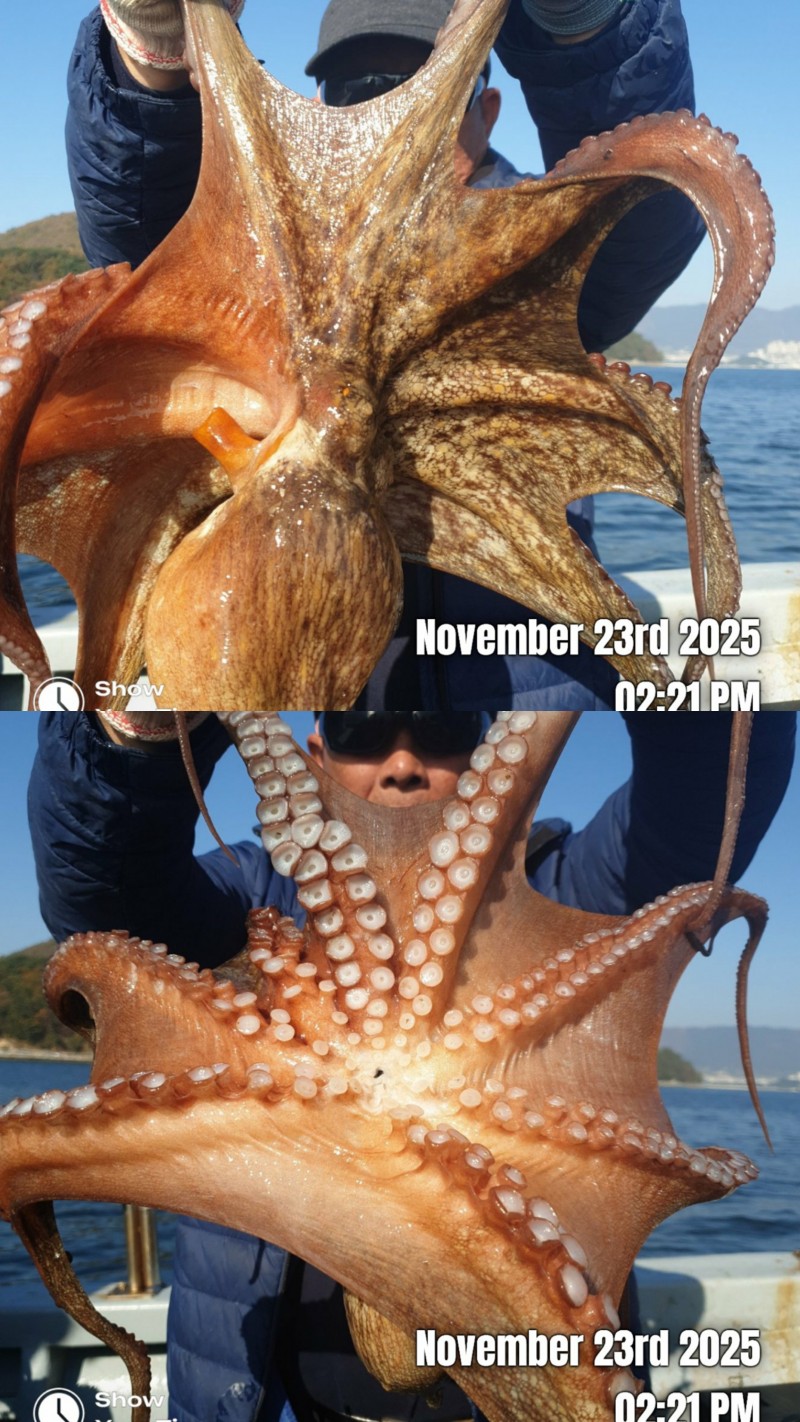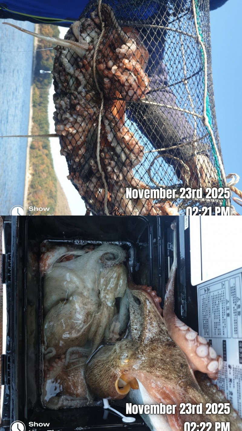 22일 토요일 오전문어 조황입니다 사리물때 빠른조류에 바람통에 힘들었네요 개인 몇수씩 하고왔습니다 2키로 1키로800 1키로700 1키로500 1키로300 등등 키로급들 중치급이상 조금잡고 왔습니다