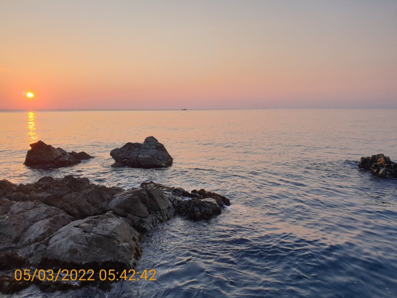 아침바다는 물색이 맑고 파도가 잔잔하며 서풍이 약하게 불고 맑은 아침입니다.