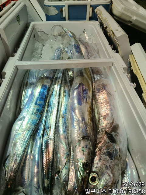 갈치가 차곡차곡 쿨러에 쌓여갈때 어느정도 쌓이고나면 물을 부어서 얼음을 살살 녹혀주세요~고기들어내고 얼음꺼내고 그러시지 마시고;; 바닷물을 부어 가면서 녹히시면 고기를 넣으실 공간이 다시 생겨요~
