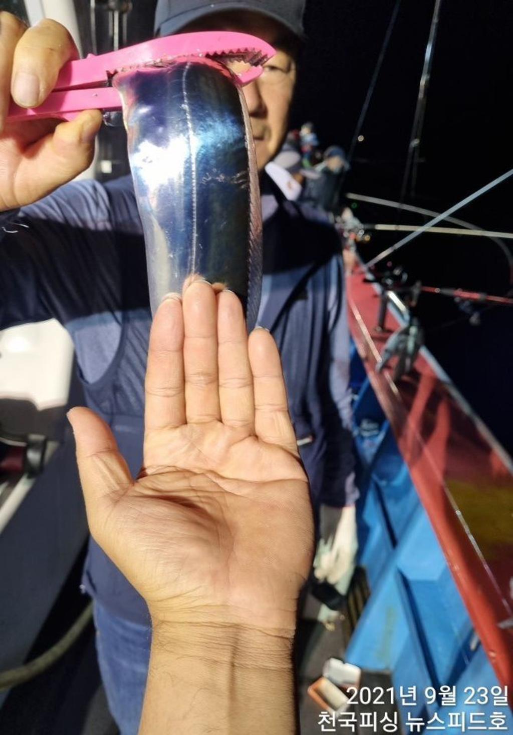 내만갈치 조황입니다~^_^ 첫포인트에서 큰씨알들이 반겨주네요~! 따문따문 올라오다가 해가지니 본격적으로 올라오기시작! 입질이 예민해도 단골 조사님들 잘잡아내십니다~! 소강상태 보여 빠르게 포인트 이동! 씨알은 골고루 섞여 올라오더니 갈수록 큰넘들 올라옵니다! 철수때까지 열심히 흔들어주신 우리 조사님들! 하얗게 불태우고 기분좋게 철수했습니다~! 모두 수고하셨습니다~! 일요일부터 쭈욱~ 예약가능합니다! 다음주 평일 자리여유 많습니다~! 계속되는 호조황~~! 갈치 손맛 입맛 끝장납니다! 주저마시고 천국피싱으로 오세요~! 언제든지 문의주세요~^_^