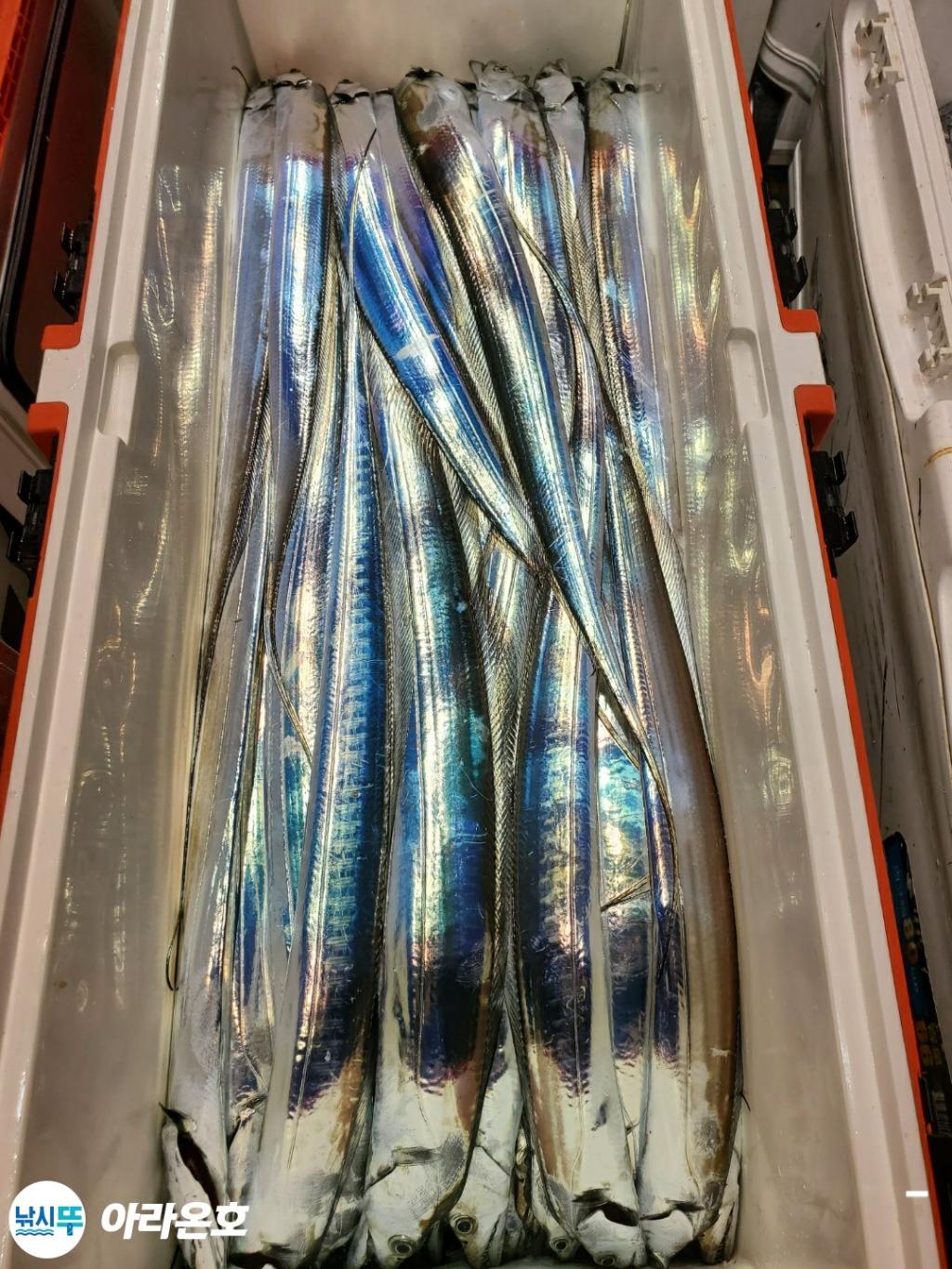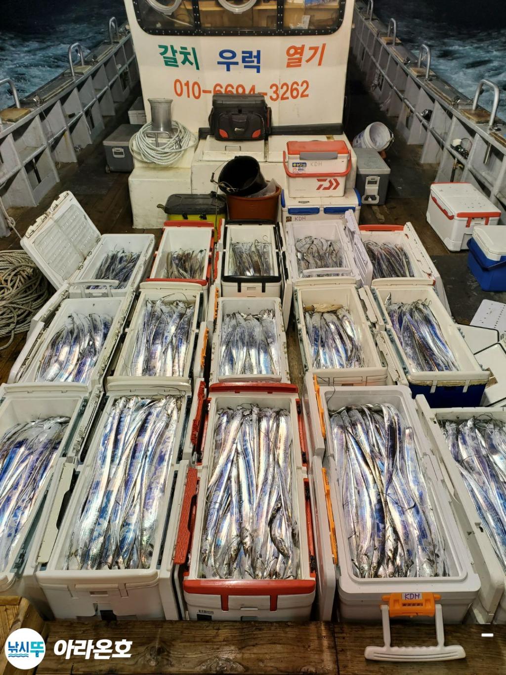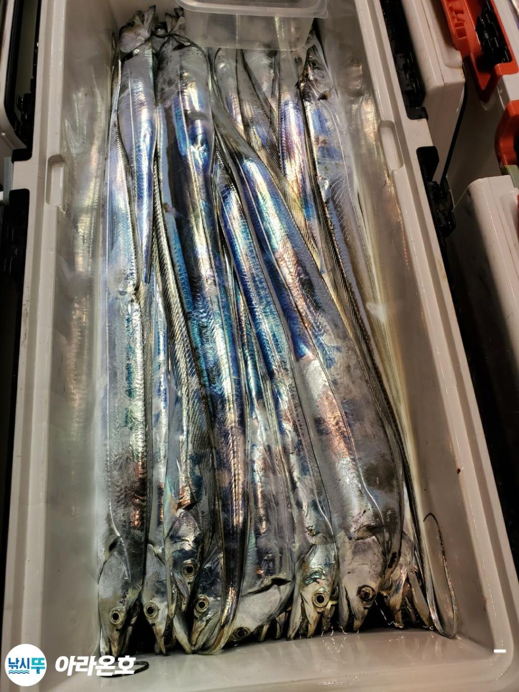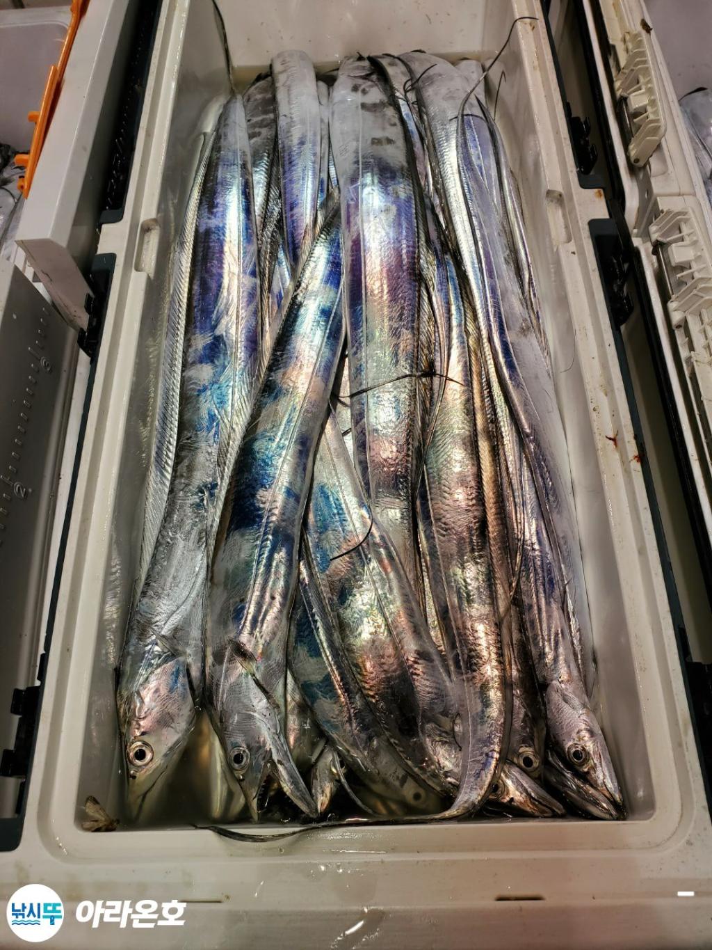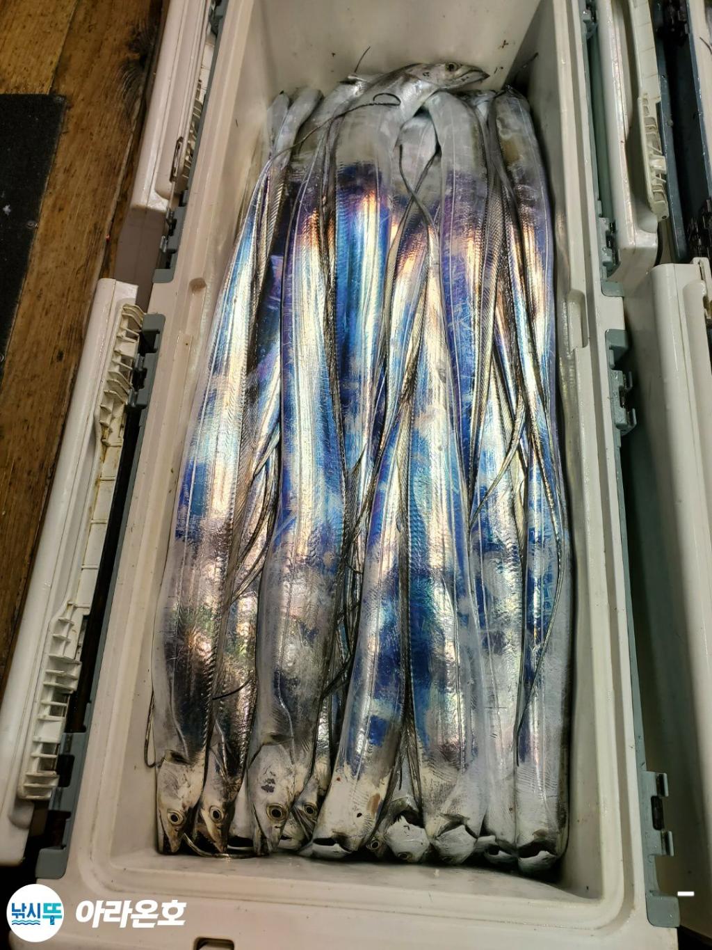 10월21일 진도권 먼바다 대갈치파티~!! 오늘도 전원쿨러조황. 초반부터 갈치파티시작하는바람에 쿨러에 물부터 때려넣고 얼음녹여가며 밤새 얼음없는쿨러에 갈치들 때려붓고 갈치 다리미질해서 한가득씩 담아왔습니다. 아라온피싱에 가을갈치이야기는 계속 대박입니다. 이틀 기상불량으로 선박재정비 개인정비를 맞추고 출항예정입니다.