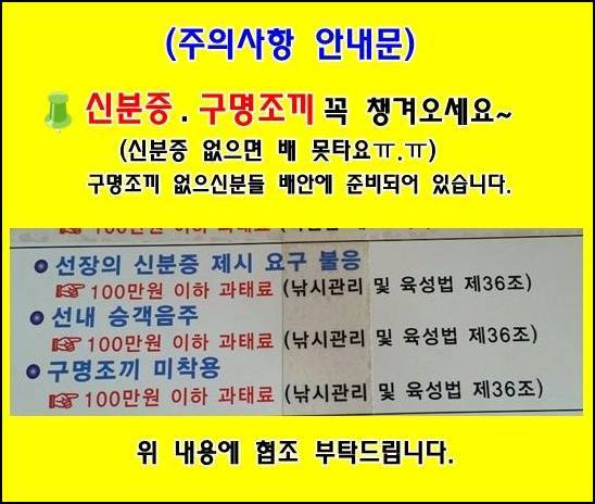 * 신분증.구명조끼 꼭 챙겨오세요~ ( 신분증 없으면 배 못타세요ㅠ.ㅠ) 구명조끼 없으신분들 배안에 준비되어 있습니다.