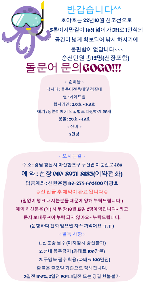 - 두족류 조황을 올리는 게시판입니다. 타 어종 등재시 예고없이 게시글 삭제 및 이용정지 됩니다. - 제목에 특수문자 사용하시면 안됩니다. (온점, 쉼표, 느낌표, 괄호, 물결만 허용) ☆ 공지사항에 조황등재시 유의사항을 꼭 확인하여 조황작성 부탁드리며, 가장 기본적인 규칙이 지켜지지 않을 시, 예고없이 삭제 및 이용정지 될 수 있음을 알려드립니다. |