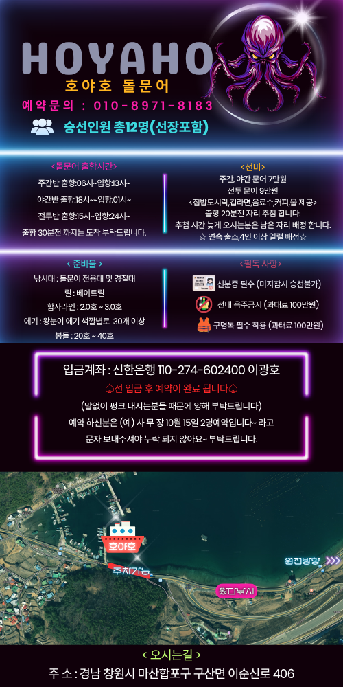 - 두족류 조황을 올리는 게시판입니다. 타 어종 등재시 예고없이 게시글 삭제 및 이용정지 됩니다. - 제목에 특수문자 사용하시면 안됩니다. (온점, 쉼표, 느낌표, 괄호, 물결만 허용) ☆ 공지사항에 조황등재시 유의사항을 꼭 확인하여 조황작성 부탁드리며, 가장 기본적인 규칙이 지켜지지 않을 시, 예고없이 삭제 및 이용정지 될 수 있음을 알려드립니다. |