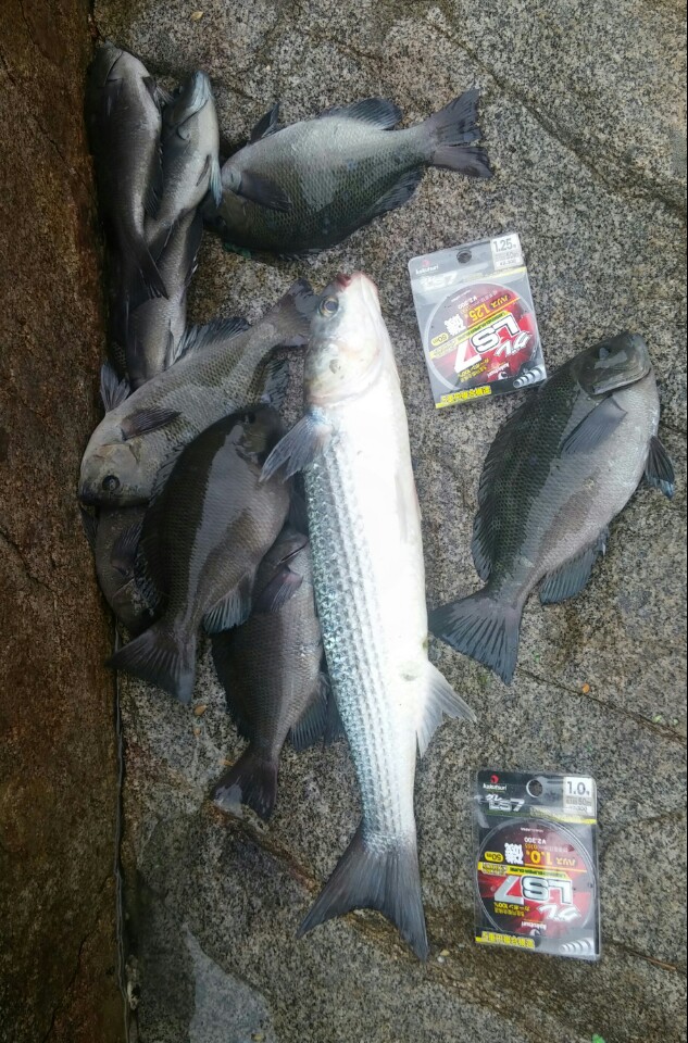 먼저 지난번에 1호 목줄을 못써본지라 오늘은 1호 목줄로 벵에 낚시를 스타트 했습니다 아침 동트자마자 시작했는데 벵에 입질이 왕성했습니다 처음채비 할때는 1호목줄도 튼튼해 보였는데요 실전에선 약하다는 느낌이 들더군요 낚시대를 연질대로 써서 그런지 사이즈에 비해 벵에 파워가 장난 아니더군요 입질은 팍팍 들어오는데 1호목줄이 세번 연속으로 터졌습니다 고기가 너무큰가 ?? 어쩔수없이 1.25호로 교체해 봅니다 엮시나 힘좀쓰는 벵에가 입질을 하는데 생각보다 사이즈가 작네요 기껏해야 25정도밖에 안되는데 1호목줄이 터지다니..... 30급 벵에라면 100% 터지겠더군요 ㅜㅜ 생각하고 기대했던것 보단 아무튼 약하단 느낌을 지울수 없네요 ^^;; 1.25호는 오늘도 괜찮았습니다 빵가루미끼에 숭어가 손님고기로 오셨는데 여러번의 실랑이 끝에 무사히 뜰채에 담는데 상공했습니다 사진 촬영후 많이 남은 밑밥도 버리고 너울을 피해서 후다닥 철수했습니다