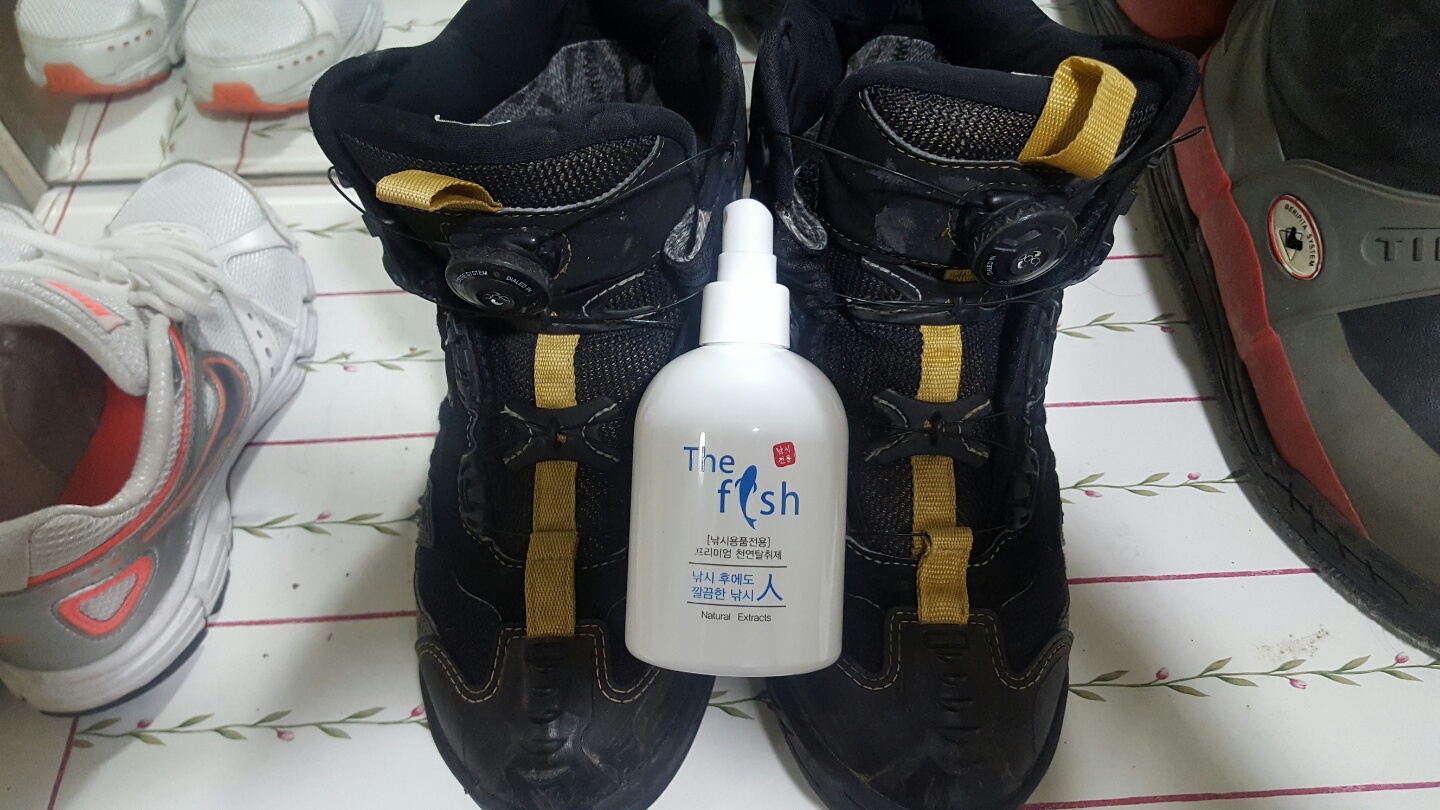 낚시화.낚시복.구명복등 출조후 매번 세탁하기힘들어 탈취제만 뿌려놓고 다음출조시 착용해봤습니다.