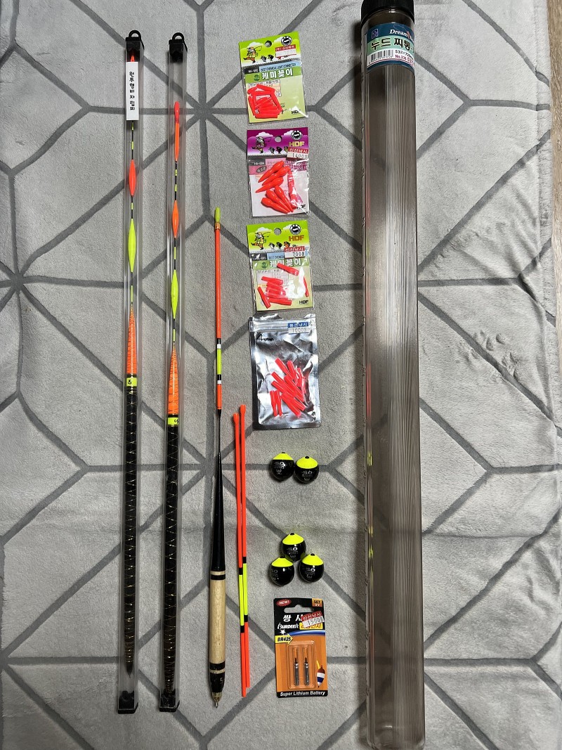 한개는 수제찌, 부력 딱 맞는 수심추 5개(신품 개당 5천원), 각종 케미꽂이, 찌톱2개, 케미건전지