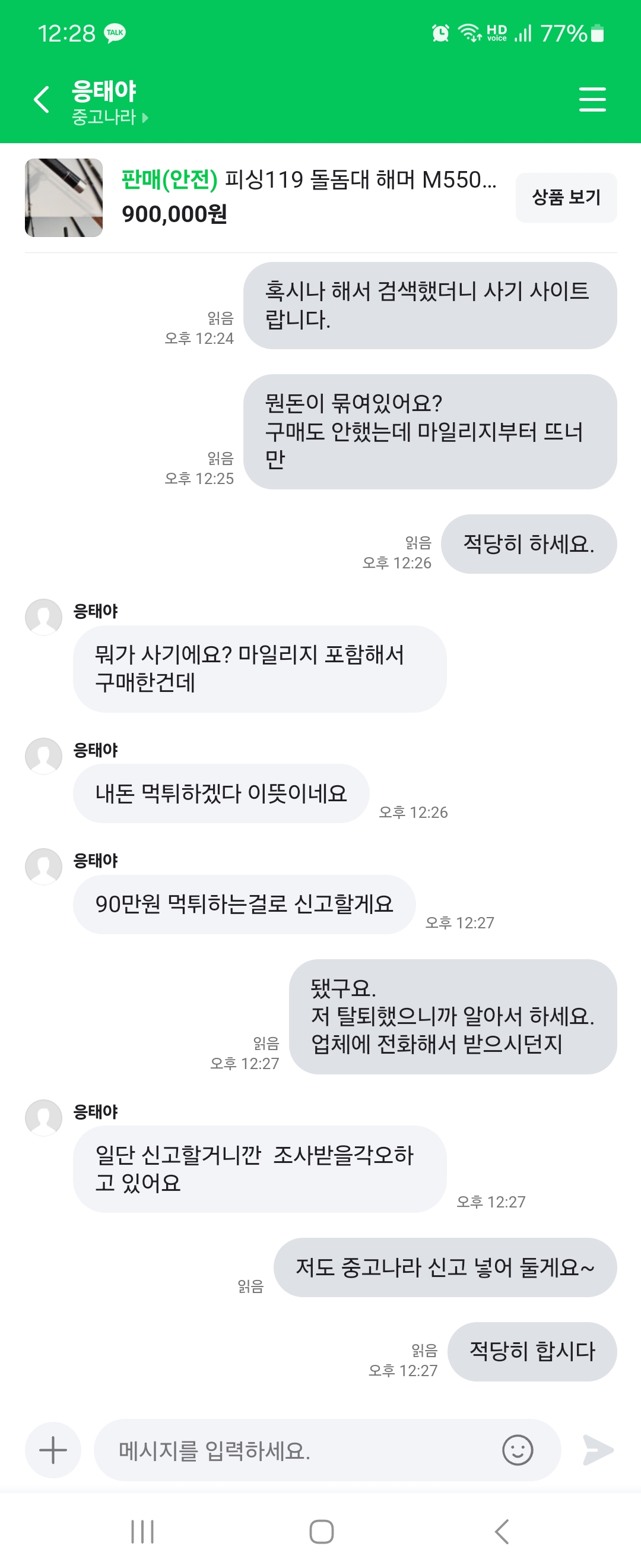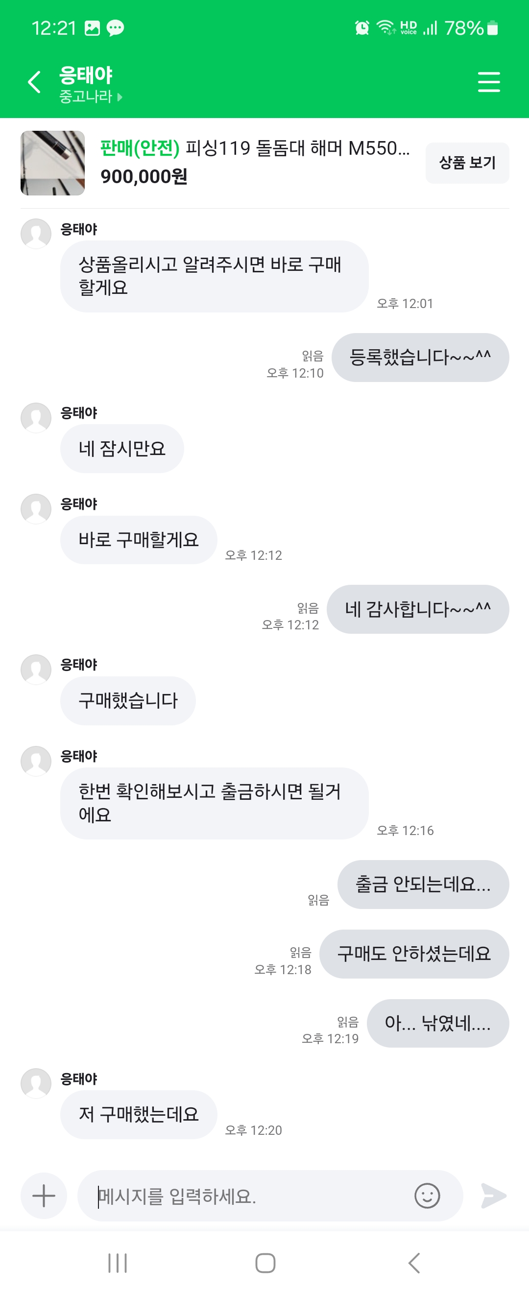 중고나라에 낚시대를 올렸는데, 구매하겠다고 채팅이 들어와서...