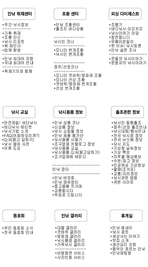 - 최근 낚시용품에 대한 많은 관심 증대를 반영하여 다양한 낚시용품 정보를 제공하고자 "조구업체 카탈로그", "신상품 정보", "낚시용품 교실", 낚시용품 Q/A", "조구업체에게 바란다"등의 메뉴를 대폭 신설하였으며, 중고용품 직거래와 관련하여 "인낚 바자회" 메뉴를 새롭게 신설하여 운영 예정입니다.